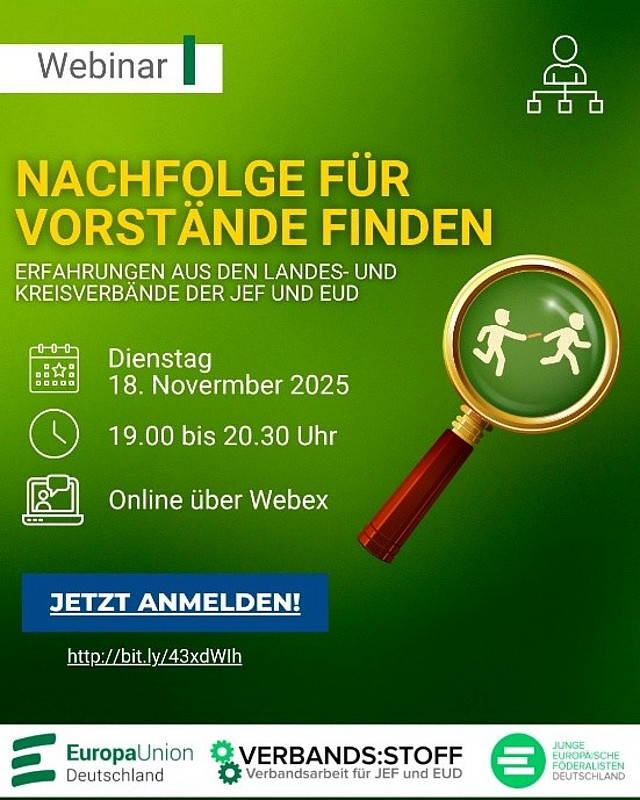 Europa-Union und JEF Deutschland laden am Dienstag, 18. November 2025, um 19.00 Uhr zu einem Webinar zum Thema Vorstandswechsel ein. Manchmal wird die Übergabe von Ämtern zum Hindernislauf: Es scheint immer schwieriger zu werden, Nachfolgerinnen und Nachfolger für Vorstandsämter in Vereinen zu gewinnen, so auch bei der JEF und der Europa-Union. „Zu viel Bürokratie, zu viel Verantwortung und zu viel Zeit“, diese „Vorurteile“ haben bestimmt viele schon einmal gehört. Dass es nicht so laufen muss, wollen wir in dieser Ausgabe der verbands:stoff Webinarreihe von JEF und Europa-Union zeigen.