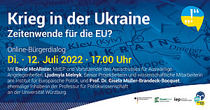 Wir laden Sie am Dienstag, den 12. Juli 2022, von 17:00 bis 18:30 Uhr herzlich zu unserem Online-Bürgerdialog „Krieg in der Ukraine: Zeitenwende für die EU?“ ein. Bringen Sie Ihre Anliegen und Fragen ein und treten Sie in den virtuellen Dialog mit:
