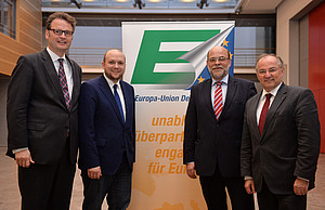 Neuer Vorstand der EUD-Parlamentariergruppe im Bundestag: Dr. Günter Krings MdB, Manuel Sarrazin MdB, Norbert Spinrath MdB und Josip Juratovic MdB (v. li.). Nicht abgebildet: Florian Hahn MdB. © Oliver Lang