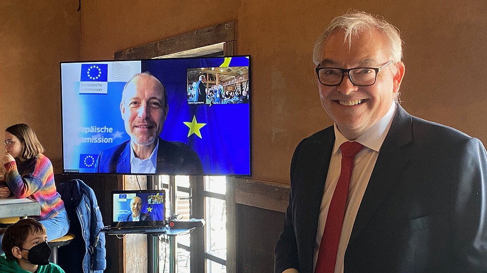 Da der traditionelle Neujahrsempfang pandemiebedingt ausfallen musste, hatte man die Veranstaltung kurzerhand in den Frühling verschoben. Nach zwei Jahren Zwangspause waren viele Mitglieder und Gäste der Einladung gefolgt. Im Zentrum der Diskussion stand die Rolle Europas im Ukraine-Krieg. Mit Dr. Jörg Wojahn hatte die überparteiliche Europa-Union einen hochkarätigen Gastredner gewonnen. Dr. Wojahn ist Leiter der Vertretung der Europäischen Kommission in Deutschland. Da er am Tag zuvor an Corona erkrankt war, wurde er online zugeschaltet. Der Vortrag und die anschließende Diskussion hatten es dennoch in sich.